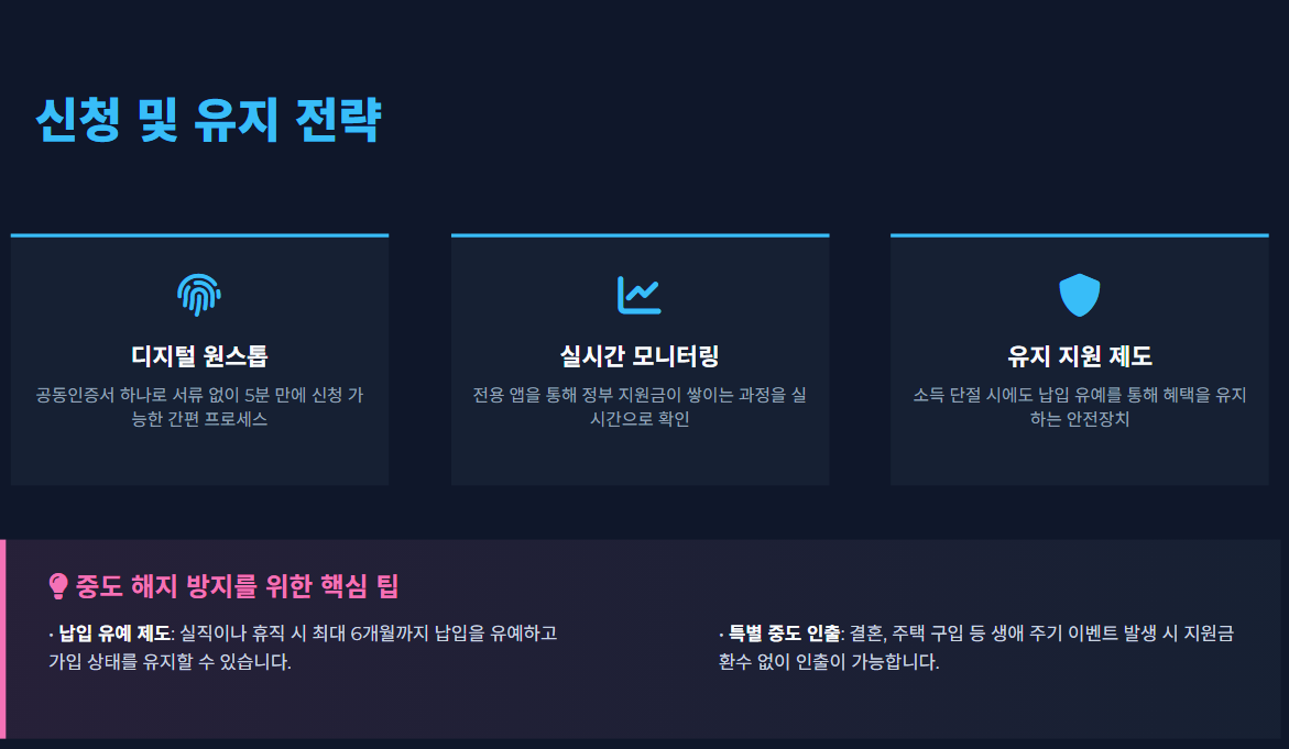 단, 중도 해지 시 정부 기여금 미지급 또는 환수 가능성이 있으므로 유지 가능성 판단이 중요합니다.