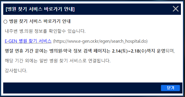 (※ 일반 진료 해당 병원들은 평상시 진료 시간이 있고, 명절 연휴에는 당직 진료 운영 여부를 응급의료포털(E-Gen) 또는 전화로 확인하세요)